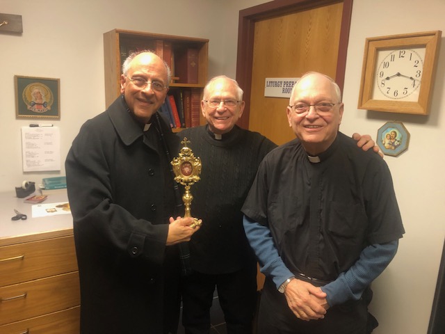 Fr. Anthony Sorgie, Fr. Robert Hohenstein, Fr. Tom Morrette (pastor of Our Lady of Victory Parish), with relic of Blessed Carlo Acutis